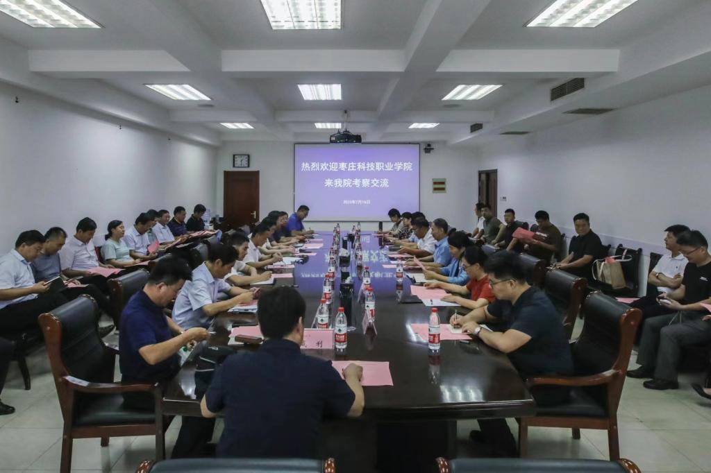 7月16日下午,枣庄科技职业学院党委书记谢宝华、党委副书记、院长闵祥寨带领领导班子成员及部门中层干部一行约40人到我院考察交流。学院党委副书记韩瑞东,学院领导李瑞昌,党委委员、办公室(统战部)主任(部长)任培华会见客人,组织人事处、学生工作处、教师工作部、教务处、科技处、发展规划处负责同志参加座谈。