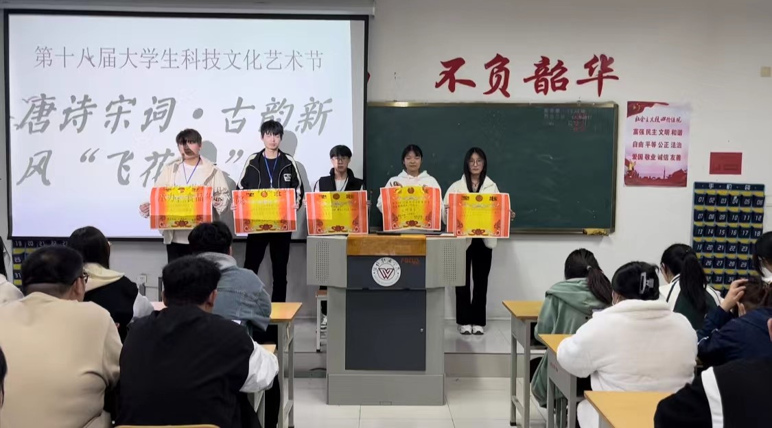 本次活动分为初赛、复赛和决赛。初赛采用线上问卷星方式进行,选拔出二十人晋级复赛;复赛现场抽签分组进行计分抢答,前六组进入决赛;决赛采用个人赛形式,参赛学生在规定时间内轮流回答。选手凭借扎实的诗词功底,给观众带来一场场精彩绝伦的诗词盛宴。经过激烈的角逐,农林科技学院陈硕获一等奖;农林科技学院朗俞添、国际商务学院王常涛获二等奖;农林科技学院陈俞任、关皓文,食品药品学院毛誉璇、信息工程学院孟晓薇获三等奖。