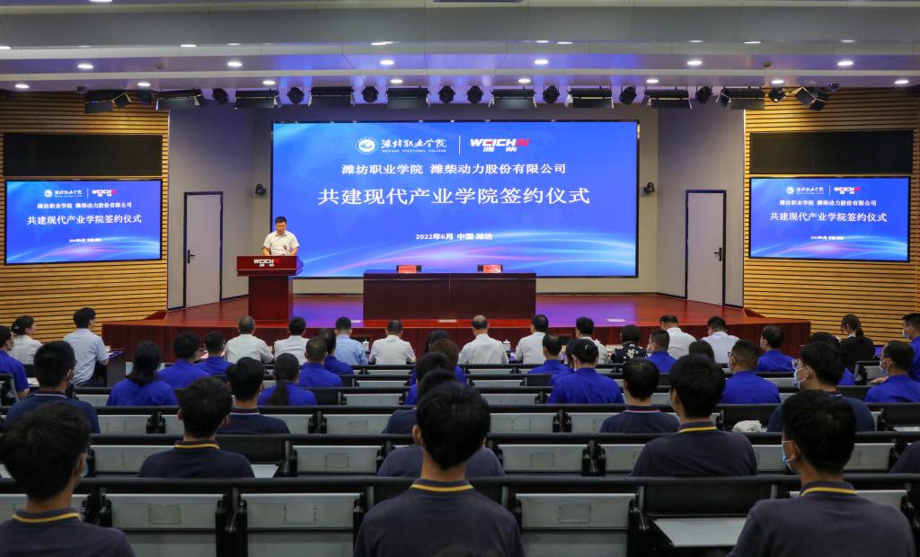 6月29日上午,学院与潍柴动力股份有限公司共建现代产业学院签约仪式在潍柴科技大楼报告厅举行。潍柴集团党委副书记、副董事长徐新玉,潍柴集团党委副书记、副总经理马常海,潍柴集团党委委员、工会主席、潍柴职业大学校长鲁文武,潍坊市产教融合研究院副院长冯秀红,学院党委书记马跃启,党委委员、副院长贺志强及产学研合作中心、汽车工程学院、机电工程学院负责人等参会。会议由潍柴职业大学常务副校长钟建民主持。