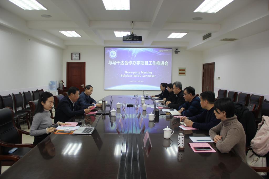 会上,创造太阳乌干达石油学院校长助理许海军回顾了自2020年以来的项目进展情况,包括前期商定合作专业并完成两门国际课程开发。桑福岭就项目取得的成绩和未来发展方向发表致辞。三方就学历生招收、师资培训、短期技能培训、后期课程开发等合作事项进行深入讨论,在人才培养方案建立、数字化教学资源开发、专业汉语培训、后续招生等方面达成多项共识。国际交流与合作处负责同志介绍了“相聚‘汉语桥’开启中国园艺文化之旅”项目,乌干达布卡拉萨农学院将组织师生积极参与该项目的注册和学习。李瑞昌就本次会议成果和下一步工作作出总结。